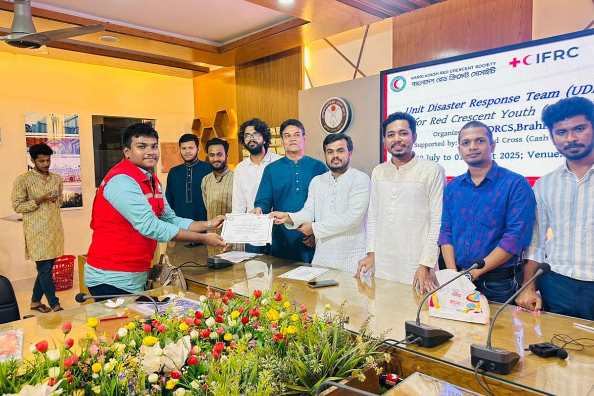 শুক্রবার (১ আগস্ট) বিকেলে বাংলাদেশ রেড ক্রিসেন্ট সোসাইটি ব্রাহ্মণবাড়িয়া ইউনিটের উদ্যোগে চার দিনব্যাপী ইউডিআরটি প্রশিক্ষণের সমাপনী ও সনদ বিতরণ অনুষ্ঠান অনুষ্ঠিত হয়েছে। ব্রাহ্মণবাড়িয়া প্রেসক্লাব মিলনায়তনে আয়োজিত অনুষ্ঠানে সভাপতিত্ব করেন ইউনিটের যুব প্রধান ফাহিম মুনতাসির। স্বেচ্ছাসেবক হোসাইন মোহাম্মদ রায়হান এর সঞ্চালনায় প্রধান অতিথির বক্তব্য রাখেন ব্রাহ্মনবাড়িয়া রেড ক্রিসেন্ট ইউনিটের নবনিযুক্ত সেক্রেটারি আতাউল্লাহ। বিশেষ অতিথি হিসেবে উপস্থিত ছিলেন ইউনিটের ভাইস চেয়ারম্যান আশরাফুল হক লিংকন এবং সদস্য আশরাফুল ইসলাম তপু।