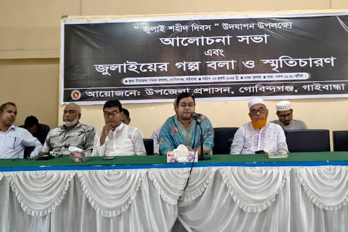 গাইবান্ধার গোবিন্দগঞ্জে জুলাই শহিদ দিবস উদযাপন করা হয়েছে। এ উপলক্ষ্যে এক আলোচনা সভা, এতে জুলাইয়ের গল্প বলা ও স্মৃতিচারণ করা হয়।