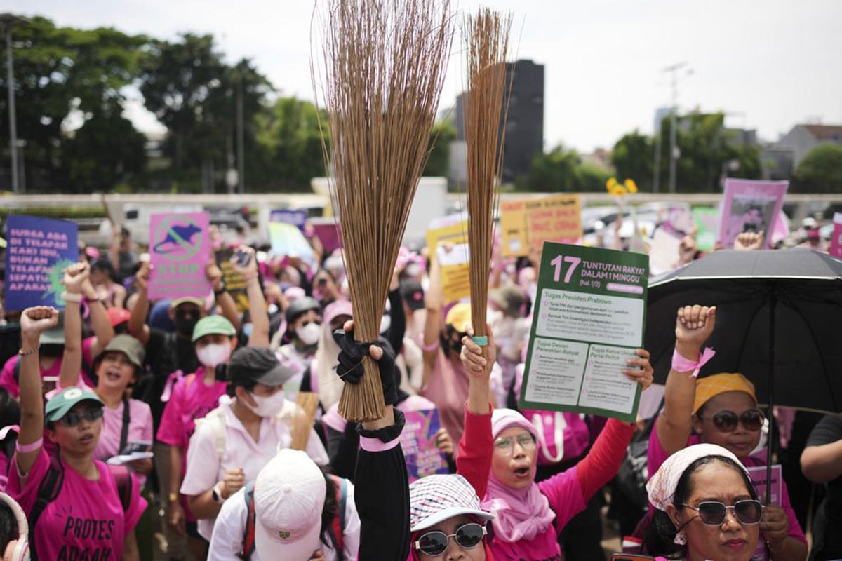 ইন্দোনেশিয়ায় ঝাড়ু হাতে বিক্ষোভ করেছেন শত শত নারী। বুধবার এই বিক্ষোভ অনুষ্ঠিত হয়। পুলিশি নির্যাতন ও সরকারি ব্যয় অপচয়ের বিরুদ্ধে প্রতিবাদ জানাতে গোলাপি পোশাক পরে বিক্ষোভে নামে নারীরা।