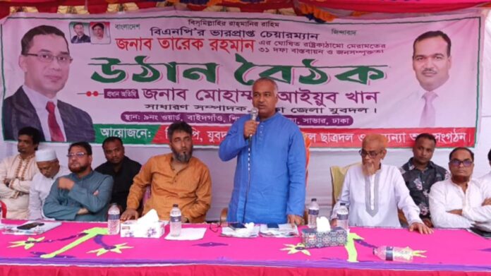 রাউফুর রহমান পরাগ : একটি কুচক্রী মহল নির্বাচন পেছানোর জন্য ষড়যন্ত্র শুরু করেছে বলে মন্তব্য করেছেন ঢাকা জেলা যুবদলের সাধারণ সম্পাদক মোহাম্মদ আইয়ুব খান। আজ শুক্রবার (২৫/০৭/২৫) বিকেলে আশুলিয়ার বাইদগাও এলাকায় অনুষ্ঠিত উঠান বৈঠকে প্রধান অতিথি হিসেবে উপস্থিত থেকে এই মন্তব্য করেন তিনি। বক্তব্যের শুরুতেই তিনি মাইলস্টোন স্কুলে নিহত ও আহতদের জন্য শোক প্রকাশ করেন। মোহাম্মদ আইয়ুব খান আরো বলেন, বিএনপি’র ভারপ্রাপ্ত চেয়ারম্যান জনাব তারেক রহমানের ৩১ দফা দ্রুত বাস্তবায়নের মাধ্যমে দেশে গণতন্ত্র ফিরিয়ে আনতে হবে। আগামী ফেব্রুয়ারীর মধ্যে নির্বাচনের মাধ্যমে দেশে একটি নির্বাচিত সরকার গঠন করে দেশকে বর্তমান সংকট থেকে মুক্ত করতে হবে। মোঃ মজিবুর রহমানের সভাপতিত্বে অনুষ্ঠিত উক্ত উঠান বৈঠকে আরো উপস্থিত ছিলেন, ঢাকা জেলা যুবদলের সাবেক সহ-সভাপতি আরিফুর রহমান, ঢাকা জেলা যুবদলের সাবেক যুগ্ন সাধারণ সম্পাদক মোঃ শফিকুল ইসলাম, ঢাকা জেলা স্বেচ্ছাসেবক দলের সাবেক যুগ্ন সাধারণ সম্পাদক মোঃ আব্দুল মালেক, সাবেক সাধারণ সম্পাদক ৯ নং ওয়ার্ড বিএনপি মোঃ বাবুল হোসেন, শিমুলিয়া ইউনিয়ন যুবদলের সাবেক সাংগঠনিক সম্পাদক হারুন, স্বেচ্ছাসেবক দলের কেন্দ্রীয় কমিটির সাবেক সদস্য মোঃ শামীম হোসেনসহ বিএনপি’র বিভিন্ন অঙ্গ সংগঠনের নেতাকর্মীরা।