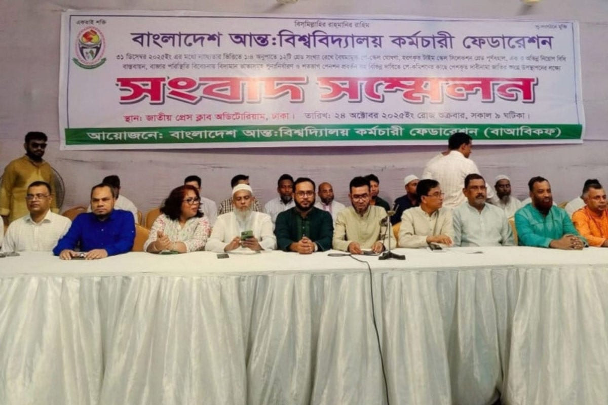 বার্ষিক ১০ শতাংশ বেতন বৃদ্ধির দাবি জানিয়েছে বাংলাদেশ আন্তঃবিশ্ববিদ্যালয় কর্মচারী ফেডারেশন। তারা চাকরিজীবীদের গ্রেড কমিয়ে ১২টি এবং ১:৪ অনুপাতে বেতন কাঠামো প্রণয়নের দাবি করেন।