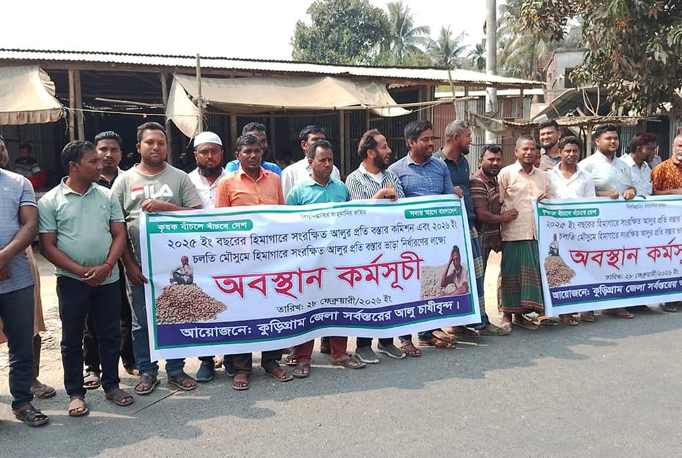 আলুচাষে লোকসানের ধাক্কা ও হিমাগার মালিকদের বছর বছর ভাড়া বৃদ্ধি ও কমিশন বন্ধের প্রতিবাদের কুড়িগ্রামে আলুচাষী ও ব্যবসায়ীরা প্রতিবাদ সমাবেশ ও মানববন্ধন করেছে।