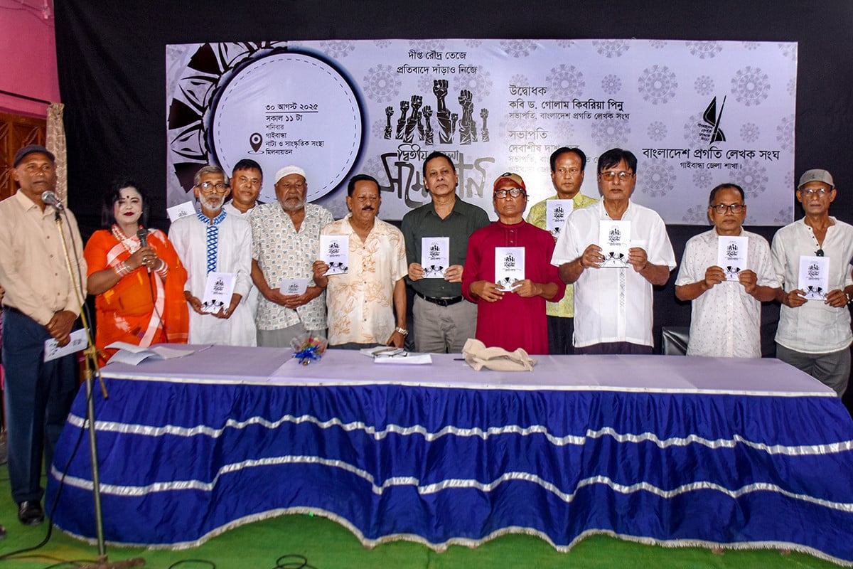 ‘দীপ্ত রৌদ্র তেজে, প্রতিবাদে দাঁড়াও নিজে’— এই স্লোগানকে সামনে রেখে বাংলাদেশ প্রগতি লেখক সংঘ গাইবান্ধা জেলা শাখার দ্বিতীয় সম্মেলন অনুষ্ঠিত হয়েছে। সম্মেলনে সব ধরনের অন্যায়-অবিচার, ভেদবুদ্ধি ও সাম্প্রদায়িকতার বিরুদ্ধে রুখে দাঁড়ানোর অঙ্গীকার ব্যক্ত করা হয়।