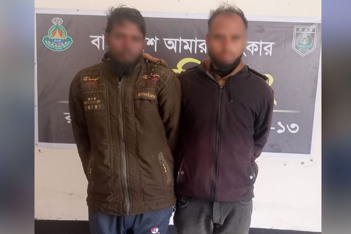 গ্রেফতার ব্যক্তিরা হলেন নীলফামারীর জলঢাকা উপজেলার গুরমন্দা ইউনিয়নের ভাবোনচোর এলাকার জাফর আলীর ছেলে দুলু মিয়া (৩৬) এবং একই এলাকার নুর ইসলামের ছেলে নুরুজ্জামান (৩৩)।