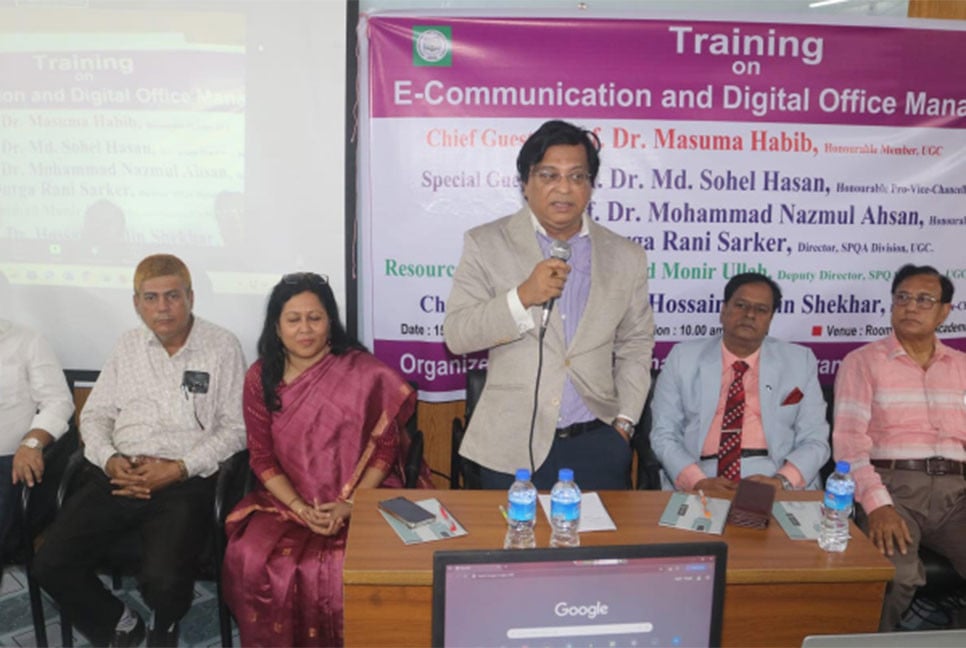 কর্মশালার উদ্বোধনী অনুষ্ঠানে প্রধান অতিথি হিসেবে ভার্চুয়ালি যুক্ত হন বাংলাদেশ বিশ্ববিদ্যালয় মঞ্জুরী কমিশনের (ইউজিসি) সদস্য প্রফেসর ড. মাছুমা হাবিব। এ সময় তিনি বলেন, ‘ই-কমিউনিকেশন ও ডিজিটাল অফিস ম্যানেজমেন্ট’ একটি সময় উপযোগী প্রশিক্ষণ। আমরা যদি কর্মকর্তাদের দক্ষ মানবসম্পদে পরিণত করতে পারি, তারাই স্মার্টলি বিশ্ববিদ্যালয়কে এগিয়ে নিতে পারবে। এতে করে অফিসের সময়ও বাঁচবে। তবে দুই দিনের প্রশিক্ষণে দক্ষ হওয়া সম্ভব নয়। যথাযথ প্রশিক্ষণ শেষে আমাদের অবশ্যই চর্চা অব্যাহত রাখতে হবে।