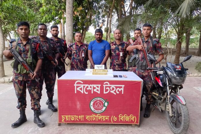 পাচারকারীর শরীর তল্লাশী করে ১৬টি স্বর্ণেরবার ও ১৪ স্বর্ণের ছোট টুকরো জব্দ করা হয়েছে। আটক আফসার আলী দামুড়হুদা উপজেলার দর্শনা থানার ঝাঁঝাডাঙ্গা গ্রামের শহিদুল ইসলামের ছেলে।