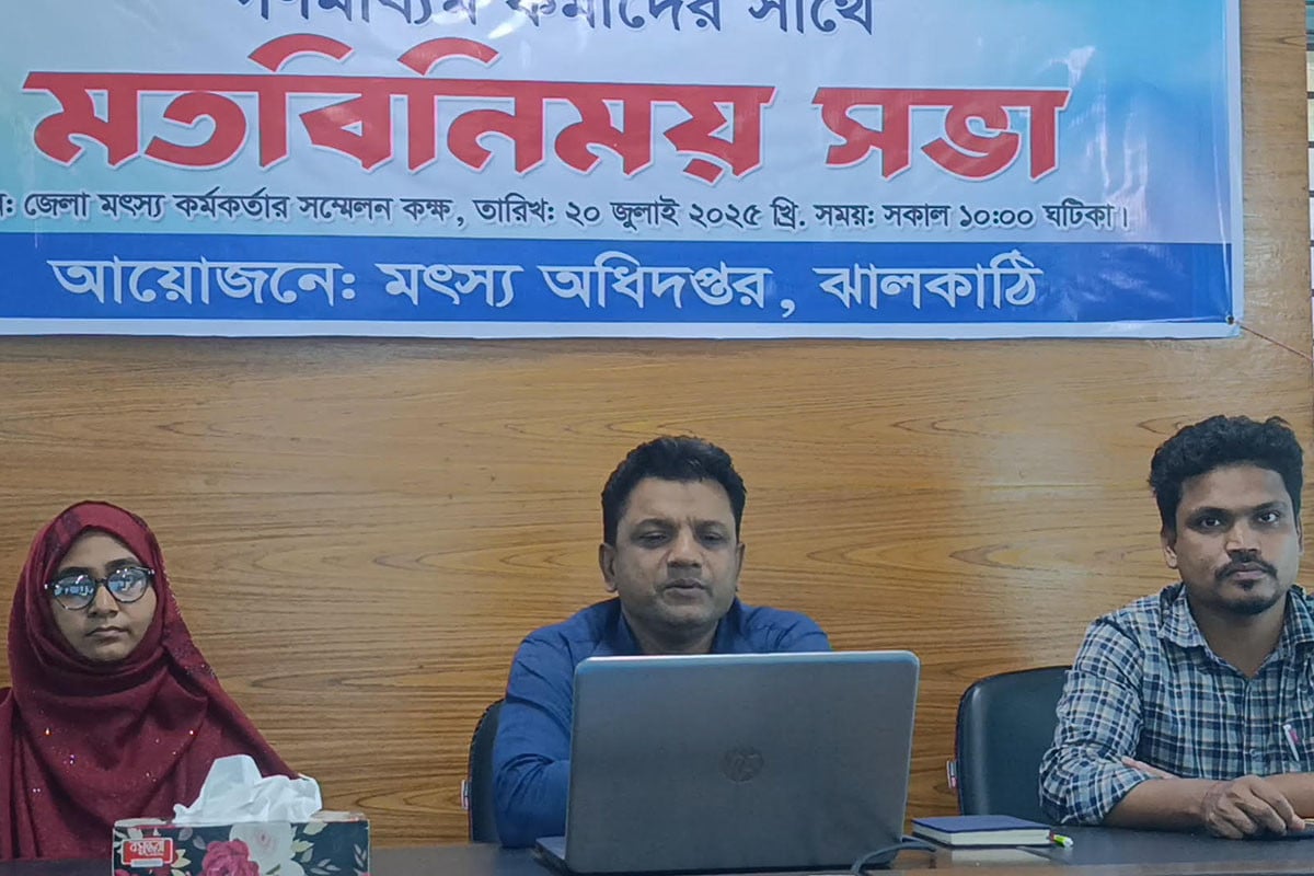 মতবিনিময় সভায় আরও উপস্থিত ছিলেন সিনিয়র উপজেলা মৎস্য কর্মকর্তা সাইয়েদ, ঝালকাঠি প্রেসক্লাবের সভাপতি কাজী খলিলুর রহমান ও সহকারী মৎস্য কর্মকর্তা নয়ন চন্দ্র শীল। সভায় ঝালকাঠির সিনিয়র সাংবাদিকরা মৎস্য সপ্তাহ সফল করতে বিভিন্ন দিকনির্দেশনা ও পরামর্শ দেন এবং জেলা মৎস্য দপ্তরের সাথে সমন্বয় রেখে সার্বিক সহযোগিতার আশ্বাস দেন।