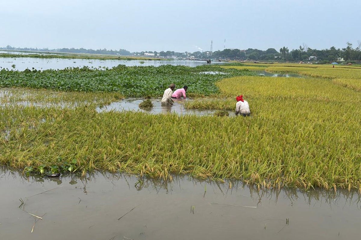 কিছু কৃষক কোমরসমান পানিতে নেমে ধান কাটার চেষ্টা করছেন। তবে ভেজা অবস্থায় ধান কাটা ও সংরক্ষণ—দুটিই কঠিন হয়ে পড়েছে।