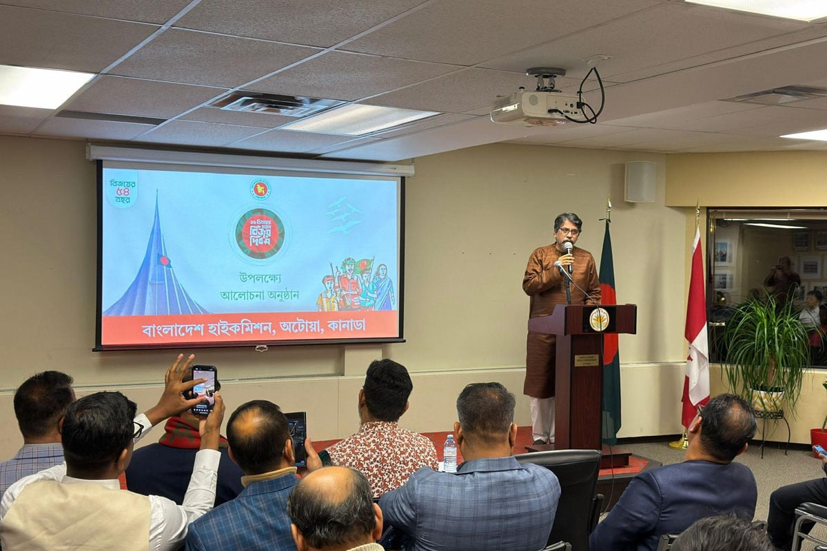 বিকেলে হাইকমিশনের অডিটোরিয়ামে বিজয় দিবস উপলক্ষে বিশেষ আলোচনা সভা অনুষ্ঠিত হয়। এতে বাংলাদেশি কমিউনিটির সদস্য, কানাডায় অধ্যয়নরত বাংলাদেশি শিক্ষার্থী এবং অন্যান্য আমন্ত্রিত অতিথিরা অংশ নেন। ১৯৭১ সালের মুক্তিযুদ্ধের শহীদদের পাশাপাশি জুলাই আন্দোলনের শহীদদের স্মরণে এক মিনিট নীরবতা পালনের মাধ্যমে অনুষ্ঠানের সূচনা হয়।