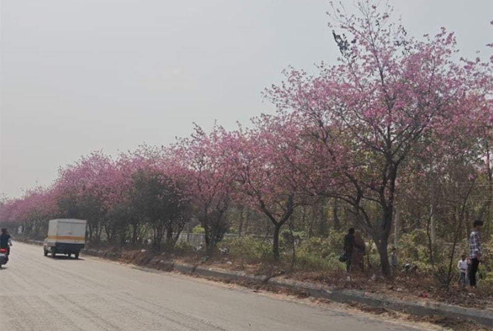 জানা গেছে, ব্যস্ততম ঢাকা-ময়মনসিংহ মহাসড়কটি চার লেনের সড়কের ডিভাইডারের উপর ফুলের বাগানে রয়েছে নীল কাঞ্চন, কামিনী, কৃষ্ণচূড়া, জোগা টগর, রাধাচূড়া, অগ্নিশ্বর, পলাশ, গৌরীচূড়া, কনক চূড়া, কনক চাঁপা, কদম, কাঠ বাদাম, জারুল, রক্ত করবী ও জাপানি চেরী গোত্রের ক্যাসিয়া রেনিজেরা। আজ থেকে তিন-চার বছর আগে পলাশ, জারুল, সোনালু, রাধাচূড়া, বাগানবিলাস, কদম, বকুল ও জবা ফুল ফুটে মুগ্ধ করে যাত্রীদের। গত বছর কিছু গাছে অল্প কিছু জাপানি ক্যাসিয়া রেনিজেরা ফুটেছিল। এবার শীত বিদায় নেওয়ার পর ওই তিন প্রজাতির ক্যাসিয়া রেনিজেরা ফুটতে শুরু করে।
