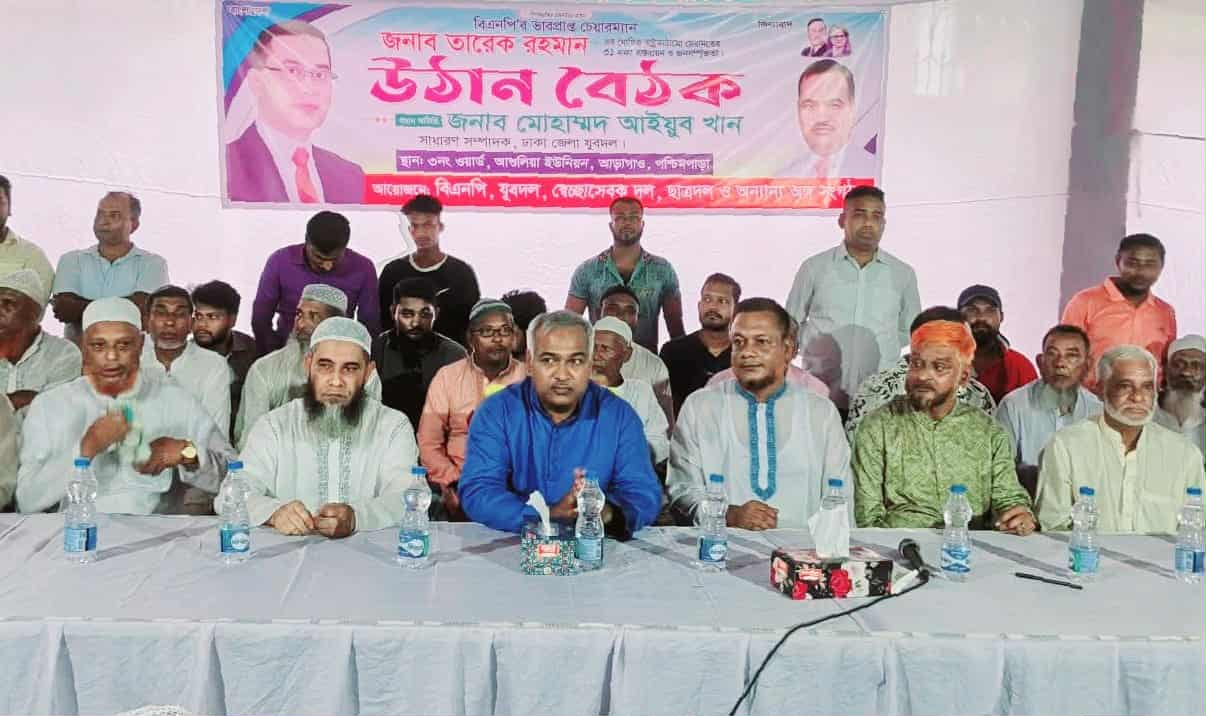 আখতার রাফি : বিএনপি’র ভারপ্রাপ্ত চেয়ারম্যান জনাব তারেক রহমানের রাষ্ট্র কাঠামো মেরামতের ৩১ দফা বাস্তবায়নের লক্ষ্যে আজ বৃহস্পতিবার (০৯-১০-২০২৫ ইং) বিকেলে আশুলিয়া ইউনিয়নের ৩ নং ওয়ার্ডে (আড়াগাও পশ্চিমপাড়া) এলাকায় স্থানীয় বিএনপি, যুবদল, ছাত্রদল ও স্বেচ্ছাসেবক দলের উদ্যোগে উঠান বৈঠক অনুষ্ঠিত হয়েছে। উক্ত উঠান বৈঠকে প্রধান অতিথি হিসেবে উপস্থিত ছিলেন ঢাকা জেলা যুবদলের সাধারণ সম্পাদক মোহাম্মদ আইয়ুব খান। এ সময় মোহাম্মদ আইয়ুব খান বলেন, দেশের বর্তমান পরিস্থিতি থেকে মুক্তি পেতে আমাদের সকলকে বিএনপির ভারপ্রাপ্ত চেয়ারম্যান জনাব তারেক রহমানের ৩১ দফা নিয়ে ঘরে ঘরে যেতে হবে এবং সবাইকে ৩১ দফা সম্পর্কে অবহিত করতে হবে। হাজী শহিদুল ইসলামের সভাপতিত্বে উক্তি অনুষ্ঠানে স্থানীয় বিএনপি যুবদল ছাত্রদল ও স্বেচ্ছাসেবক দলের নেতাকর্মী এবং এলাকার গণ্যমান্য ব্যক্তিবর্গ উপস্থিত ছিলেন। উক্ত উঠান বৈঠকটির সার্বিক তত্ত্বাবধানে ছিলেন রুস্তম আলী শিকদার।