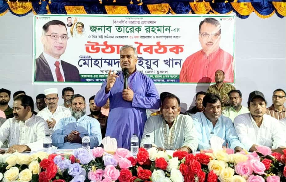 আখতার রাফি : বাংলাদেশে গণতন্ত্র পুনরায় প্রতিষ্ঠার জন্য আগামী জাতীয় নির্বাচনে সকলকে ধানের শীষে ভোট দেওয়ার আহবান জানিয়েছেন ঢাকা জেলা যুবদলের সাধারণ সম্পাদক মোহাম্মদ আইয়ুব খান। এছাড়াও তিনি আরো বলেন, বাংলার জনগণের ঐক্যবদ্ধতা বিএনপির মূল শক্তি, এই শক্তি আগামীতে সুন্দর ও সুখী বাংলাদেশ গড়তে সবচেয়ে বড় অবদান রাখবে। আজ শুক্রবার( ২৪/১০/২৫ ইং) বিকেলে সাভার পৌরসভার ৫ নং ওয়ার্ডে স্থানীয় বিএনপি, যুবদল, ছাত্রদল, ও স্বেচ্ছাসেবক দলের উদ্যোগে আয়োজিত উঠান বৈঠকে প্রধান অতিথি হিসেবে উপস্থিত থেকে এসব মন্তব্য করেন তিনি। সময় মোহাম্মদ আইয়ুব খান বিএনপির ভারপ্রাপ্ত চেয়ারম্যান জনাব তারেক রহমানের ৩১ দফা প্রতিটি ঘরে ঘরে পৌঁছে দেওয়ার জন্য তিনি নেতাকর্মীদের আহ্বান জানান। উক্ত উঠান বৈঠকটি সভাপতিত্ব করেন বিএনপি নেতা মোহাম্মদ নজরুল ইসলাম খোকন।এছাড়া এ উঠান বৈঠকে আরো উপস্থিত ছিলেন ঢাকা জেলা যুবদলের সাবেক সহ সভাপতি আব্বাসউদ্দিন পাপ্পু, ঢাকা জেলা যুবদলের সাবেক সহ সভাপতি মোস্তফা সরদার,ঢাকা জেলা যুবদলের সাবেক সহ সভাপতি শহিদুল ইসলাম শহিদ, ঢাকা জেলা যুবদলের সাবেক যুগ্ন সাধারন সম্পাদক আসাদুজ্জামান টিটু, নজরুল ইসালম,ঢাকা জেলা যুবদলের সাবেক সহ সাধারন সম্পাদক মজিবর রহমান, আব্দুর রাজ্জাক, ঢাকা জেলা যুবদলের সাবেক সহ সাংগঠনিক সম্পাদক কাজী মোসলেমুর রহমান চন্দন, ঢাকা জেলা যুবদলের সাবেক সহ দপ্তর সম্পাদক ইশতিয়াক এনাম ভূইয়া তানিম, ঢাকা জেলা ছাত্রদলের সাবেক যুগ্ন সাধারন সম্পাদক মেহফুজুল আলম সাগর,সাভার থানা ছাত্রদলের সাবেক সাধারন সম্পাদক শওকত হোসেন খোকন, সাভার পৌর ১ নং ওয়ার্ডের সাবেক সভাপতি লায়ন সাকিল, সাভার থানা ছাত্রদলের সাবেক সিনিয়র যুগ্ন সাধারন সম্পাদক এরশাদ হোসেন জয়, ঢাকা জেলা উত্তর ছাত্রদলের সাবেক যুগ্ন আহবায়ক সাদ্দাম হোসেন,জাহাঙ্গীরনগর বিশ্ববিদ্যালয় ছাত্রদলের সাবেক ছাত্রনেতা জহুরুল ইসলাম জহির,জিয়া সৈনিক দলের কেন্দ্রীয় কমিটির সাধারন সম্পাদক মনসুর মুন্না সহ স্থানীয় বিএনপি, যুবদল, ছাত্রদল ও স্বেচ্ছাসেবক দলের নেতা কর্মী ও এলাকার গণ্যমান্য ব্যক্তিবর্গ।