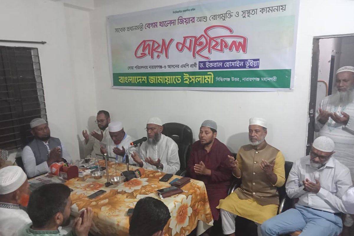 নারায়ণগঞ্জের সিদ্ধিরগঞ্জ উত্তর থানা জামায়াতে ইসলামীর উদ্যোগে সাবেক প্রধানমন্ত্রী ও বিএনপি চেয়ারপারসন বেগম খালেদা জিয়ার আশু রোগমুক্তি ও সুস্থতা কামনায় দোয়া মাহফিল অনুষ্ঠিত হয়েছে।
