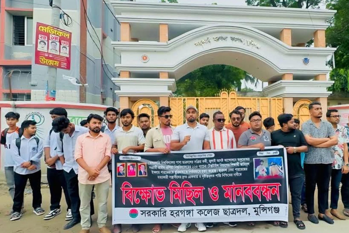 সোমবার বেলা সাড়ে ১২টার দিকে সরকারি হরগঙ্গা কলেজ ছাত্রদলের আয়োজনে কলেজ ফটকের সামনে এই বিক্ষোভ মিছিল ও মানববন্ধন অনুষ্ঠিত হয়।