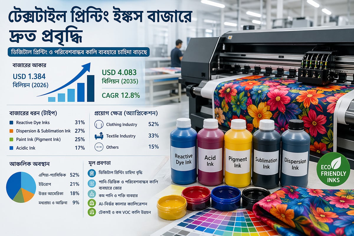 বিশ্বজুড়ে টেক্সটাইল শিল্পে ডিজিটালাইজেশন ও পরিবেশবান্ধব উৎপাদনের প্রবণতা বাড়ায় টেক্সটাইল প্রিন্টিং ইঙ্কস বাজারে দীর্ঘমেয়াদি প্রবৃদ্ধির সম্ভাবনা তৈরি হয়েছে। সূত্র: বিজনেস রিসার্চ ইনসাইটস
