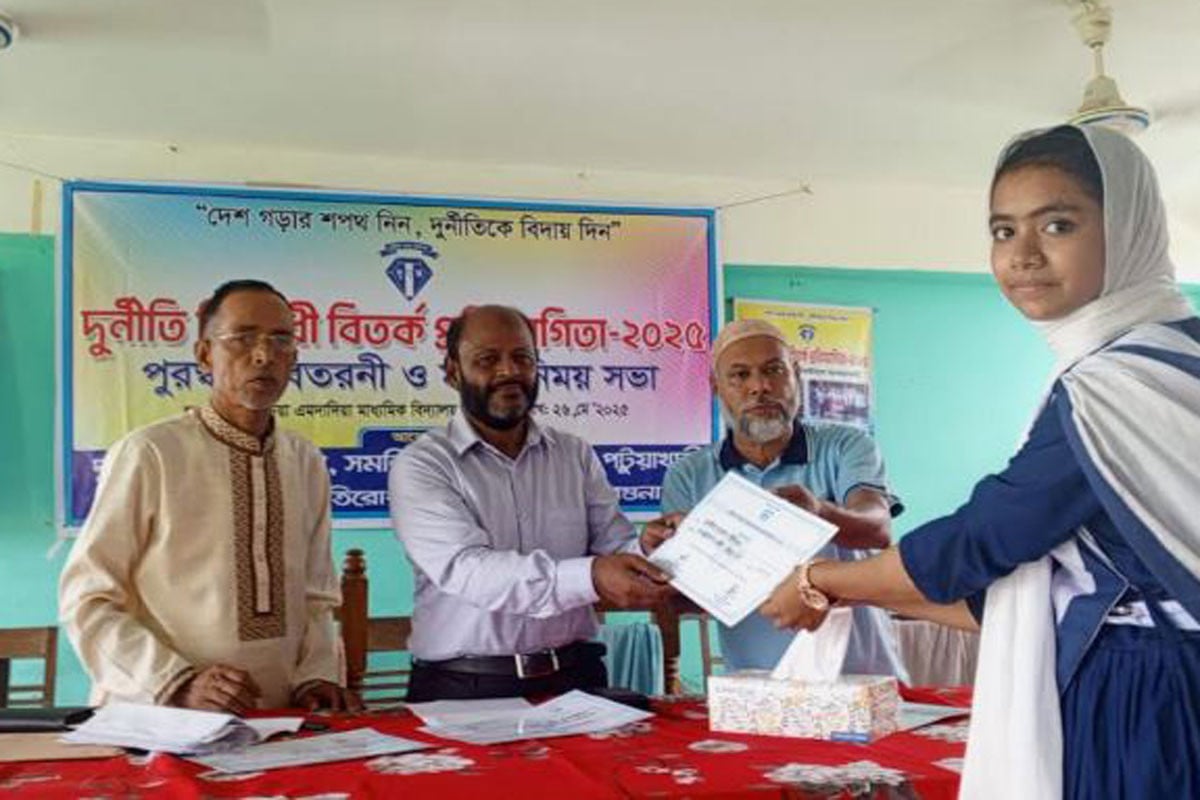বরগুনার বেতাগীতে দুর্নীতি প্রতিরোধে শিক্ষার্থীদের মধ্যে সচেতনতা ও সততার চর্চা বৃদ্ধির লক্ষ্যে দুর্নীতি বিরোধী বিতর্ক প্রতিযোগিতা, মতবিনিময় সভা ও পুরস্কার বিতরণী অনুষ্ঠান অনুষ্ঠিত হয়েছে।