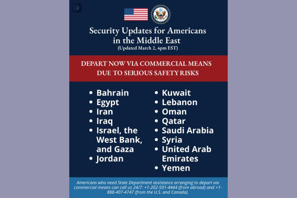 ইরানের সঙ্গে চলমান সংঘাতের জেরে মার্কিন নাগরিকদের এখনই মধ্যপ্রাচ্যের কয়েকটি দেশ ছাড়ার তাগিদ দিয়েছে যুক্তরাষ্ট্রের পররাষ্ট্র দফতর।