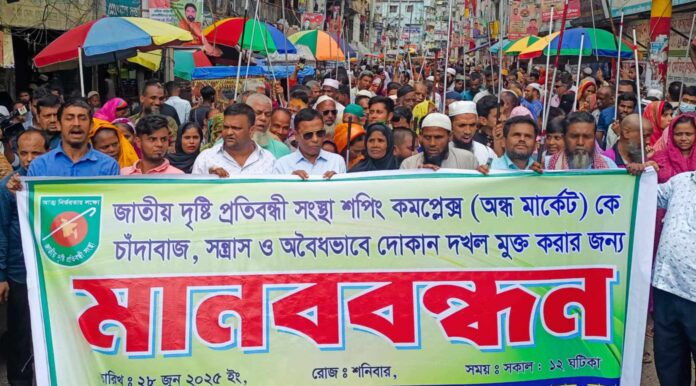 মার্কেট রক্ষার দাবিতে সাভারে দৃষ্টি প্রতিবন্ধীদের মানববন্ধন