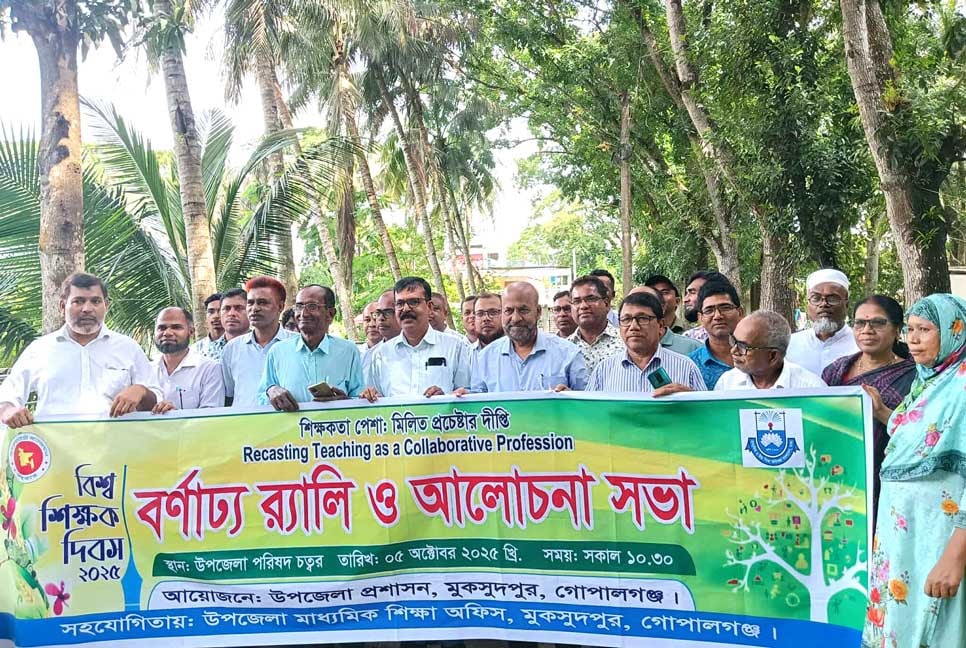 গোপালগঞ্জের মুকসুদপুরে বিশ্ব শিক্ষক দিবস উপলক্ষে র্যালি ও আলোচনা সভা অনুষ্ঠিত হয়েছে। রবিবার (৫ অক্টোবর) সকালে মুকসুদপুর উপজেলা প্রশাসনের আয়োজনে এবং উপজেলা মাধ্যমিক শিক্ষা অফিসের সহযোগিতায় উপজেলা পরিষদ চত্বর থেকে একটি র্যালি বের হয়ে উপজেলা শহরের প্রধান প্রধান সড়ক প্রদক্ষিণ করে। পরে উপজেলা শিক্ষা অফিস কার্যালয়ে এক আলোচনা সভা অনুষ্ঠিত হয়।