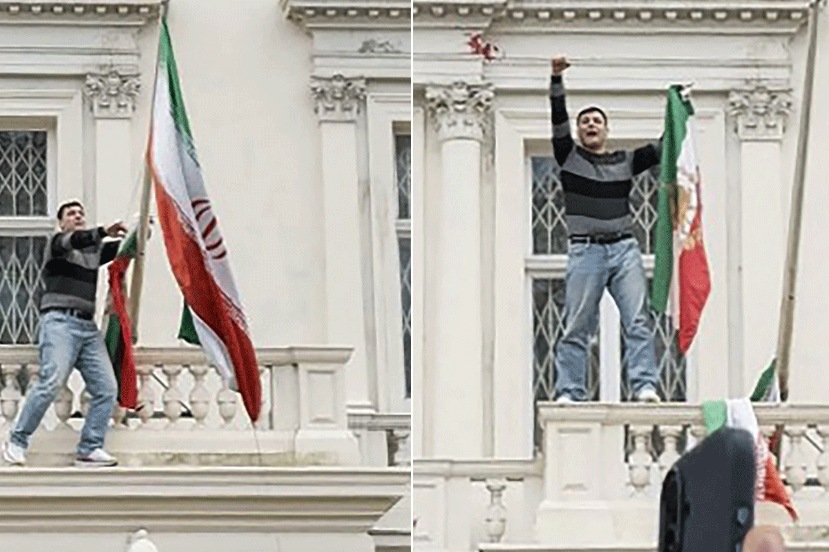 এরপর তিনি তাবাসের প্রবেশপথের উপরের বারান্দায় ১৯৭৯ সালের ইসলামি বিপ্লব-পূর্ববর্তী ইরানের রাজকীয় পতাকা (যাতে সিংহ এবং সূর্যের প্রতীক রয়েছে) প্রদর্শন করেন। এদিকে এ ঘটনায় ছড়িয়ে পড়া ভিডিওতে দেখা গেছে, বিক্ষুব্ধ জনতা অপমানজনক স্লোগান দেওয়ার সময় দূতাবাসের কর্মীরা বিকল্প ব্যানারটি সরিয়ে ফেলেন।