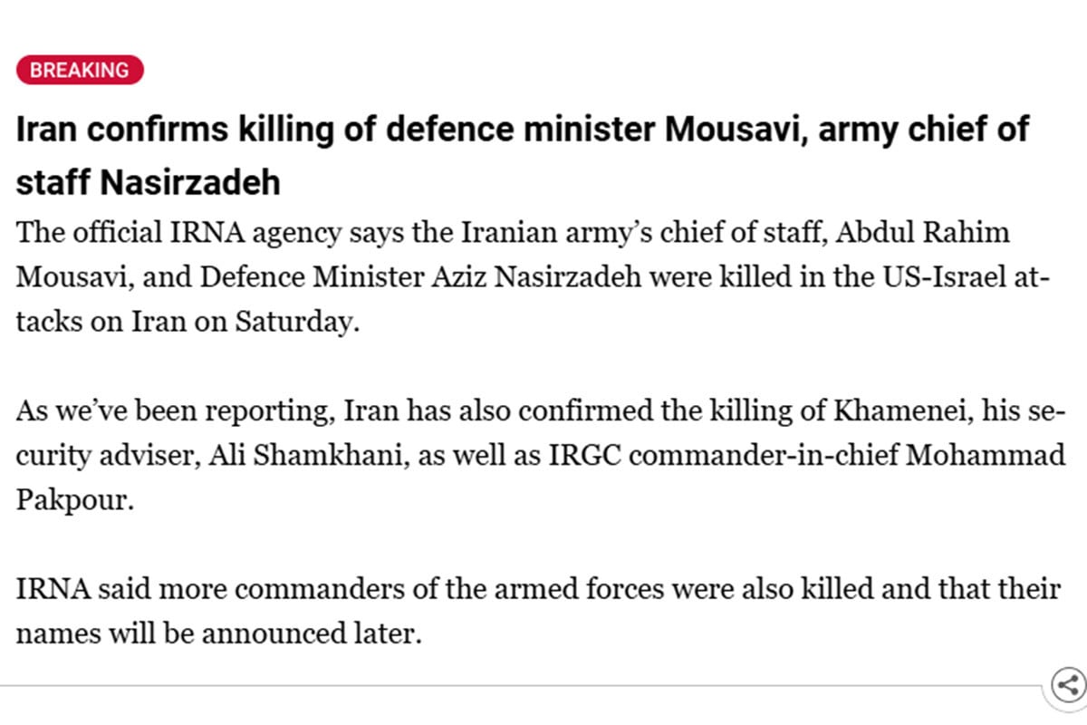 ইরানের সরকারি সংবাদ সংস্থা আইআরএনএ জানিয়েছে, ইরানের সেনাপ্রধান আব্দুল রহিম মুসাভি এবং দেশটির প্রতিরক্ষা মন্ত্রী আজিজ নাসিরজাদেহ যুক্তরাষ্ট্র ও ইসরায়েলের হামলায় নিহত হয়েছেন।