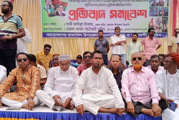 সমাবেশে রামপালের বিএনপি নেতারা বলেন, গত ৫ আগস্টের পর থেকে স্বৈরাচারের দোসর খুলনা সিটির সাবেক মেয়র তালুকদার আব্দুল খালেক ও সাবেক উপমন্ত্রী হাবিবুন নাহারের দোসরদের সাথে নিয়ে চিংড়ি ঘের দখল, হামলা, লুটপাট ও ভাঙচুর চালিয়ে উপজেলাজুড়ে সন্ত্রাসের রাজত্ব কায়েম করেছেন উপজেলা বিএনপির আহ্বায়ক শেখ হাফিজুর রহমান তুহিন। এরই ধারাবাহিকতায় গত বৃহস্পতিবার উপজেলার ঝনঝনিয়া, চেয়ারম্যান মোড়, ভাগা ও রনসেন এলাকায় তিনি আওয়ামী লীগের ক্যাডার বাহিনীর সদস্যদের সাথে নিয়ে বিএনপি নেতাকর্মীদের উপর হামলা-ভাঙচুরের নেতৃত্ব দেন। হামলায় বিএনপির ১৫ নেতাকর্মী আহতসহ চিংড়ি ঘের ও বাড়িঘর ভাঙচুর করা হয়। এই হামলায় নেতৃত্ব দেওয়া উপজেলা বিএনপির আহ্বায়ক তুহিনকে দল থেকে বহিষ্কারের দাবি জানান তারা। অন্যথায় দ্রুত কঠোর কর্মসূচি পালনের ঘোষণা দেওয়া হবে বলে হুঁশিয়ারি দেন বক্তারা।