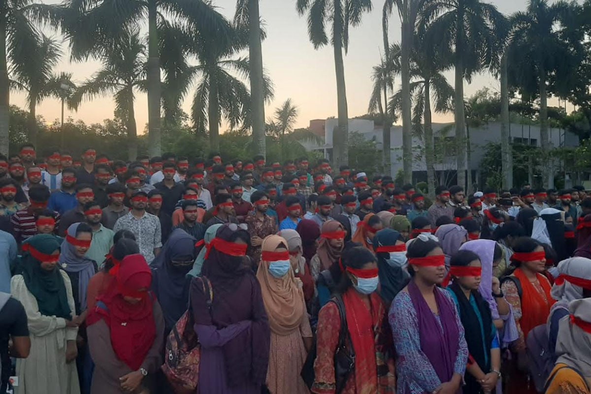বৃহস্পতিবার বিকাল সাড়ে ৫টায় বিশ্ববিদ্যালয়ের আমতলা থেকে মিছিলটি শুরু হয়ে সমাবর্তন চত্বরে এসে শেষ হয়। এর আগে বিকাল হতেই শিক্ষার্থীরা বিভিন্ন হল থেকে আমতলায় এসে জড়ো হয়। পরে মাথায় লাল কাপড় বেঁধে কেন্দ্রীয় গ্রন্থাগার সংলগ্ন করিডোর থেকে মৌন মিছিল শুরু হয়। মিছিল নিয়ে করিডোর প্রদক্ষিণ করে তারা সমাবর্তন চত্বরে পৌঁছান এবং সেখানে অবস্থান কর্মসূচি পালন করেন। এ সময় তারা মাথার লাল কাপড় খুলে চোখে বেঁধে নেন।