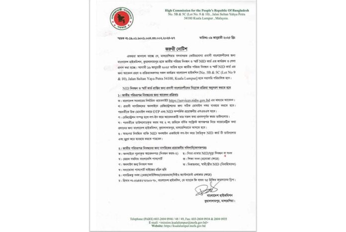 মালয়েশিয়ায় বসবাসরত প্রবাসী বাংলাদেশিদের জন্য বহু প্রতিক্ষিত জাতীয় পরিচয়পত্র (এনআইডি) নিবন্ধন এবং স্মার্ট কার্ড বিতরণ কার্যক্রম চালু হতে যাচ্ছে। আগামী ১৬ জানুয়ারি ২০২৫ থেকে এই সেবা কার্যক্রম শুরু হবে। কুয়ালালামপুরস্থ বাংলাদেশ হাইকমিশনে় সরাসরি উপস্থিত হয়ে এই সেবা গ্রহণ করা যাবে বলে বিশেষ এক বিজ্ঞপ্তির মাধ্যমে জানিয়েছে হাইকমিশন। ৯ জানুয়ারি ইস্যুকৃত এক বিজ্ঞপ্তির মাধ্যমে হাইকমিশন জানিয়েছে যে, মালয়েশিয়ায় বসবাসরত ভোটারযোগ্য প্রবাসী বাংলাদেশীদের জন্য বাংলাদেশ হাইকমিশন, কুয়ালালামপুর হতে জাতীয় পরিচয় নিবন্ধন ও স্মার্ট এনআইডি কার্ড এর কার্যক্রম ও সেবা প্রদান করা হচ্ছে। আগামী ১৬ জানুয়ারি ২০২৫ তারিখ হতে জাতীয় পরিচয় নিবন্ধন ও স্মার্ট এনআইডি কার্ড এর জন্য আবেদন গ্রহণ ও প্রক্রিয়াকরণসহ সকল কার্যক্রম বাংলাদেশ হাইকশিন নং ৫বি এবং ৫সি (লট নং ৯ ও ১০), জালান সুলতান ইয়াহয়া পেত্রা, ৫৪১০০, কুয়ালালামপুর হতে সরাসরি পরিচালিত হবে।