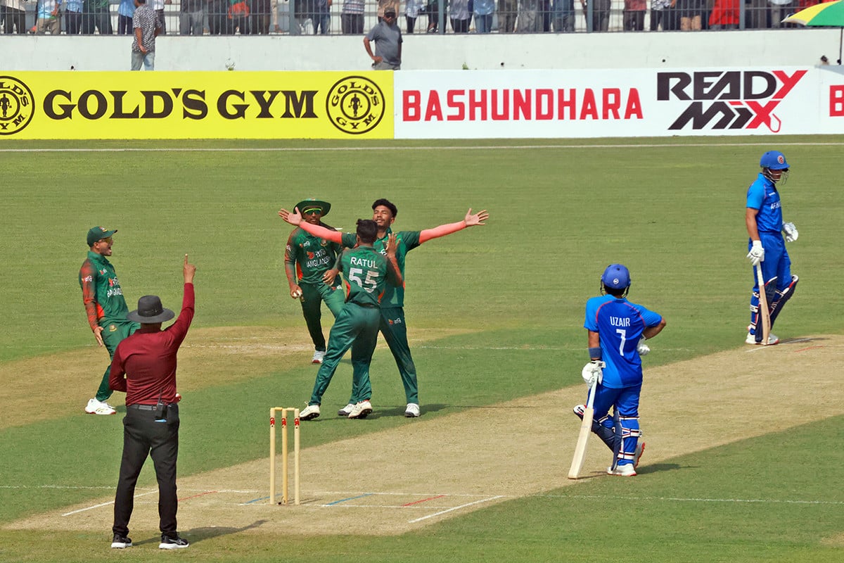 আজ মঙ্গলবার সকালে বগুড়া শহীদ চাঁন্দু স্টেডিয়ামে আফগানিস্তান ও বাংলাদেশের অনূর্ধ্ব-১৯ দলের দুই অধিনায়ক টস করতে নামেন। টসে জয়ী আফগান অধিনায়ক মাহবুব খান ব্যাটিং করার সিদ্ধান্ত নেন। ৫০ ওভারের খেলায় প্রথমে ব্যাট করে আফগানরা ৯ উইকেট হারিয়ে ২৬৫ রান সংগহ করেন। আফগান ব্যাটারদের মাঝে উজারাইল্লাহ ১৩৭ বলে ১৪০ রান সগ্রহ করেন। আফগানদের পক্ষে আর কোন ব্যাটসম্যানরা বড় ভূমিকা রাখতে পারেননি। উজারাইল্লাহকে সঙ্গ দিয়ে খালিদ ৩৪, ফয়সাল ৩৩ ও ওসমান ১৫ রান করেন। অপর পক্ষে বাংলাদেশের পক্ষে বোলার ইকবাল হোসেন ইমন ৫৭ রানে ৫টি, রিজান ৫৪ রানে ২টি এবং সবুজ ও তামিম একটি করে ইউকেট নেন। জবাবে বাংলাদেশ দলের কালাম সিদ্দিকী এলিনের সেঞ্চুরীতে ভর করে শেষ পর্যন্ত ৪৬ ওভারে ৪ উইকেট হারিয়ে ২৩১ রান সংগ্রহ করার পর আলো স্বল্পতা দেখা দেওয়ায় ম্যাচ আম্পায়ার দুই দলের অধিনায়করে সঙ্গে কথা বলেন। আলোর অভাব দেখা দিলে ক্রিকেট খেলার আইনে (ডিএলএস মেথড) বাংলাদেশ দলকে ৫ রানে জয়ী ঘোষণা করা হয়। ম্যাচে স্বাগতিকদের পক্ষে কালাম সিদ্দিকী এলিন ১১৯ বলে ১০১, রিজান ৯৬ বলে ৭৫ এবং রিফাত ২৬ রান করেন। বাংলাদেশ দলের জয়ে সবচেয়ে বড় ভূমিকা রাখেন এলিন। ফলাফল হিসেবে এলিন ম্যান অব দ্যা ম্যাচের পুরস্কারও পেয়ে যান। আর তাকে সঙ্গ দেন রিজান। বাংলাদেশ দলের ২ উইকেট পড়ার পর ইনিংসকে মেরামত করেন এই জুটি। এই জুটিই স্বাগতিকদের জয়ের ভীত গড়ে দেন। এর আগে টাইগার বোলার ইমন আফগানদের ব্যাটিং লাইন আপে ধ্বস নামান। আফগান বোলারদের মধ্যে ওয়াহিদুল্লাহ ৪৭ রানে ২টি, শাহীন ও নুরুস্তানি একটি করে উইকেট অর্জন করেন। টাইগার যুবাদের মধ্যে দলের হয়ে দায়িত্বপূর্ণ বোলিং করেন বোলার ইকবাল হোসেন ইমন।