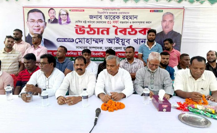 আখতার রাফি : বিএনপি’র ভারপ্রাপ্ত চেয়ারম্যান জনাব তারেক রহমানের রাষ্ট্র কাঠামো মেরামতের ৩১ দফা বাস্তবায়নের মাধ্যমে সুখী ও দারিদ্র্যমুক্ত বাংলাদেশ গড়া সম্ভব হবে বলে মন্তব্য করেছেন ঢাকা জেলা যুবদলের সাধারণ সম্পাদক মোহাম্মদ আইয়ুব খান। এছাড়াও তিনি আরো বলেন, বাংলার জনগণের ঐক্যবদ্ধতা বিএনপির মূল শক্তি, এই শক্তি আগামীতে সুন্দর ও সুখী বাংলাদেশ গড়তে সবচেয়ে বড় অবদান রাখবে। আজ বৃহস্পতিবার ( ১৬/১০/২৫ ইং) বিকেলে বিরুলিয়া ইউনিয়ন এর ৮ নং ওয়ার্ডে বিএনপি’র ভারপ্রাপ্ত চেয়ারম্যান জনাব তারেক রহমানের ৩১ দফা বাস্তবায়নের লক্ষ্যে আয়োজিত এক উঠান বৈঠকে প্রধান অতিথি হিসেবে উপস্থিত থেকে এই  মন্তব্য করেন তিনি। এ সময় মোহাম্মদ আইয়ুব খান বিএনপির ভারপ্রাপ্ত চেয়ারম্যান জনাব তারেক রহমানের ৩১ দফা প্রতিটি ঘরে ঘরে পৌঁছে দেওয়ার জন্য তিনি নেতাকর্মীদের আহ্বান জানান।বিএনপি প্রবিন নেতা ফরহাদ শিরালী এর সভাপতিত্বে উক্ত অনুষ্ঠানে আরো উপস্থিত ছিলেন ঢাকা জেলা যুবদলের সাবেক সহ সভাপতি আব্বাস উদ্দিন পাপ্পু, ঢাকা জেলা যুবদলের সাবেক সহ সভাপতি মোস্তফা সরদার, ঢাকা জেলা যুবদলের সাবেক সহ সভাপতি শহিদুল ইসলাম শহিদ, যুবদল নেতা সাইদুল ইসলাম, ঢাকা জেলা যুবদলের সাবেক সহ সাংগঠনিক সম্পাদক শওকত হোসেন খোকন, ঢাকা জেলা ছাত্রদলের সাবেক সিনিয়ার যুগ্ন সম্পাদক মেহফুজুল আলম সাগর, ঢাকা জেলা যুবদলের সাবেক সহ দপ্তর সম্পাদক ইশতিয়াক এনাম ভূইয়া তানিম, ঢাকা জেলা যুবদলের সাবেক সম্মানিত সদস্য মোহাম্মদ শাহজাহান, রাব্বিল, সাভার থানা যুবদল নেতা শাহাবুদ্দিন, বিল্লাহ হোসেন সাজু, রনি,আওলাদ হোসেন সহ স্থানীয় বিএনপি, যুবদল, ছাত্রদল ও স্বেচ্ছাসেবক দলের নেতা কর্মী ও এলাকার গণ্যমান্য ব্যক্তিবর্গ।